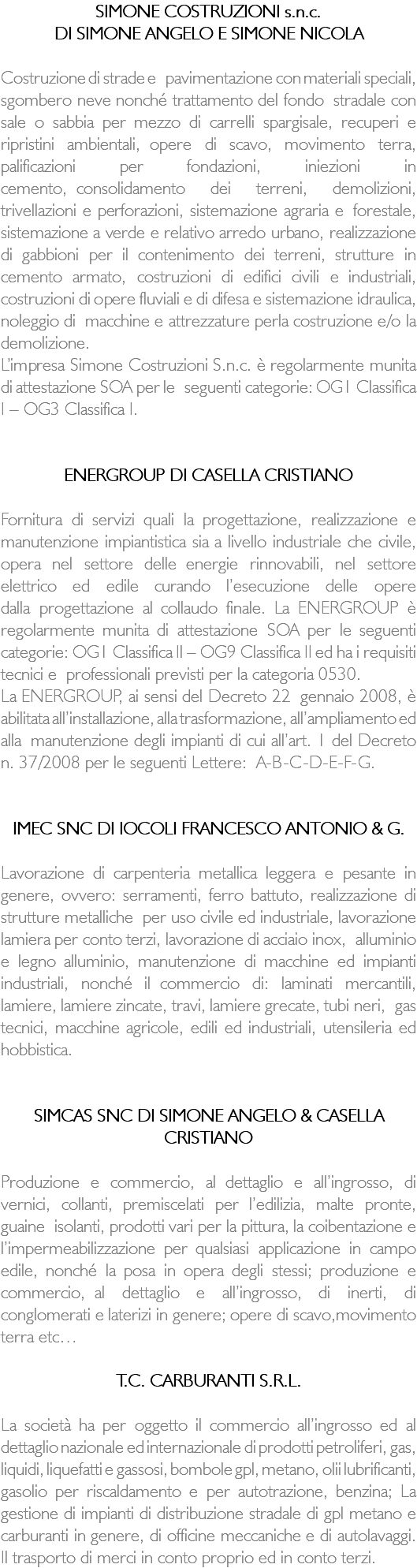 SIMONE COSTRUZIONI s.n.c. DI SIMONE ANGELO E SIMONE NICOLA Costruzione di strade e pavimentazione con materiali speciali, sgombero neve nonché trattamento del fondo stradale con sale o sabbia per mezzo di carrelli spargisale, recuperi e ripristini ambientali, opere di scavo, movimento terra, palificazioni per fondazioni, iniezioni in cemento, consolidamento dei terreni, demolizioni, trivellazioni e perforazioni, sistemazione agraria e forestale, sistemazione a verde e relativo arredo urbano, realizzazione di gabbioni per il contenimento dei terreni, strutture in cemento armato, costruzioni di edifici civili e industriali, costruzioni di opere fluviali e di difesa e sistemazione idraulica, noleggio di macchine e attrezzature perla costruzione e/o la demolizione. L’impresa Simone Costruzioni S.n.c. è regolarmente munita di attestazione SOA per le seguenti categorie: OG1 Classifica I – OG3 Classifica I. ENERGROUP DI CASELLA CRISTIANO Fornitura di servizi quali la progettazione, realizzazione e manutenzione impiantistica sia a livello industriale che civile, opera nel settore delle energie rinnovabili, nel settore elettrico ed edile curando l’esecuzione delle opere dalla progettazione al collaudo finale. La ENERGROUP è regolarmente munita di attestazione SOA per le seguenti categorie: OG1 Classifica Il – OG9 Classifica II ed ha i requisiti tecnici e professionali previsti per la categoria 0530. La ENERGROUP, ai sensi del Decreto 22 gennaio 2008, è abilitata all’installazione, alla trasformazione, all’ampliamento ed alla manutenzione degli impianti di cui all’art. 1 del Decreto n. 37/2008 per le seguenti Lettere: A-B-C-D-E-F-G. IMEC SNC DI IOCOLI FRANCESCO ANTONIO & G. Lavorazione di carpenteria metallica leggera e pesante in genere, ovvero: serramenti, ferro battuto, realizzazione di strutture metalliche per uso civile ed industriale, lavorazione lamiera per conto terzi, lavorazione di acciaio inox, alluminio e legno alluminio, manutenzione di macchine ed impianti industriali, nonché il commercio di: laminati mercantili, lamiere, lamiere zincate, travi, lamiere grecate, tubi neri, gas tecnici, macchine agricole, edili ed industriali, utensileria ed hobbistica. SIMCAS SNC DI SIMONE ANGELO & CASELLA CRISTIANO Produzione e commercio, al dettaglio e all’ingrosso, di vernici, collanti, premiscelati per l’edilizia, malte pronte, guaine isolanti, prodotti vari per la pittura, la coibentazione e l’impermeabilizzazione per qualsiasi applicazione in campo edile, nonché la posa in opera degli stessi; produzione e commercio, al dettaglio e all’ingrosso, di inerti, di conglomerati e laterizi in genere; opere di scavo,movimento terra etc… T.C. CARBURANTI S.R.L. La società ha per oggetto il commercio all’ingrosso ed al dettaglio nazionale ed internazionale di prodotti petroliferi, gas, liquidi, liquefatti e gassosi, bombole gpl, metano, olii lubrificanti, gasolio per riscaldamento e per autotrazione, benzina; La gestione di impianti di distribuzione stradale di gpl metano e carburanti in genere, di officine meccaniche e di autolavaggi. Il trasporto di merci in conto proprio ed in conto terzi. COSTRUZIONI DE MIERI SAS. DI DE MIERI DOMENICO & C. Costruzione, manutenzione e recupero, in proprio e per conto di terzi, di opere stradali, portuali, idrauliche, idroelettriche, edilizie, ferroviarie, ed in genere ogni costruzione di ingegneria civile in italia ed all’estero. COSTRUZIONI DE MIERI SAS. è regolarmente munita di attestazione SOA per le seguenti categorie: OG1 Classifica I – OG3 Classifica I – OGG Classifica III. CERVINO s.r.l. Fabbricazione e posa in opera di conglomerati bituminosi, produzione di conglomerati cementizi. L’impresa CERVINO s.r.l. è regolarmente munita di attestazione SOA per le seguenti categorie: OG3 Classifica V. La certificazione di qualità è rilasciata da CERTIQUALITY s.r.l.. ECOS s.r.l Trasporto di merci su strada; costruzione di edifici residenziali e non residenziali; preparazione del cantiere edile e sistemazione del terreno. SIMONE s.r.l. Esercente attività di commercio all’ingrosso e nolo di materiali e attrezzature da costruzione. STUDIO TECNICO DI CARLUCCI GIUSEPPE Attività tecniche svolte da geometri (Cartografia – Topografia – Catasto – Edilizia – Assistenza alle Imprese). I.E.S.A.S. SNC DI NICOLA ABATE & C. Attività di movimento di terra; esecuzione di opere stradali e idrauliche; lavori di sistemazione agraria, forestale e di verde pubblico; - Lavori speciali: depurazione delle acque e impianti di trattamento dei rifiuti; lavori di carpenteria metallica; costruzione e ristrutturazione di edifici civili ed industriali; costruzione e manutenzione di acquedotti, fognature, gasdotti, impianti di irrigazione; lavori di difesa e sistemazione idraulica; produzione e vendita di materiali e attrezzature per l’edilizia e l’impiantistica in generale.