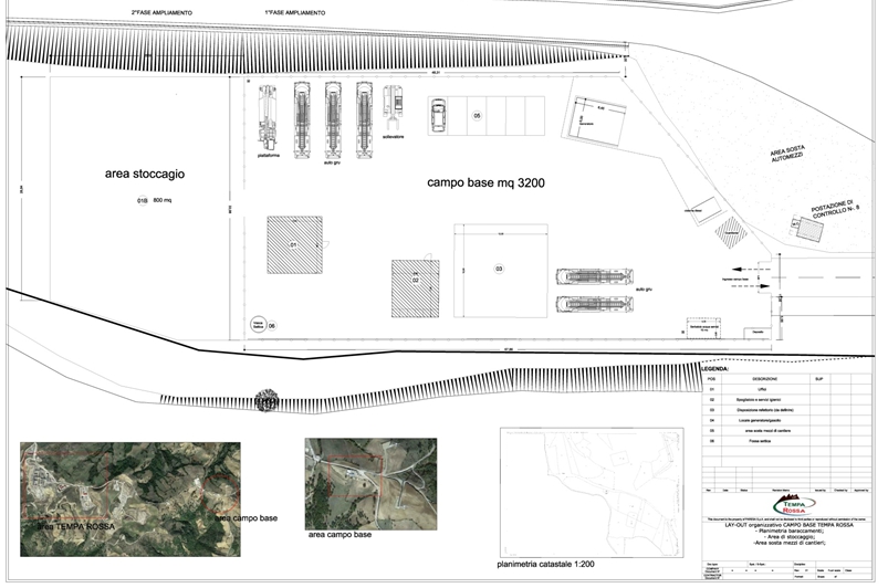 L’area destinata agli uffici, nonché allo stazionamento ed allo stoccaggio dei mezzi di cantiere e delle attrezzature è individuata nel campo base del gruppo CDS sito in contrada San Canio in Gorgoglione. Distante circa 2,5 km dal sito Tempa Rossa, la base operativa in oggetto, regolarmente autorizzata dal Comune di Gorgoglione , si sviluppa su una superficie di circa 3500 mq, servita da tutte le urbanizzazioni primarie e secondarie si presenta con tutti i baraccamenti presenti (vedi layout interno) agibile e conforme alla funzione in essere.